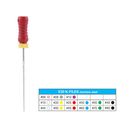 K-Files in acciaio inossidabile • Codice colore ISO • Flessibile e durevole • Puņ essere sterilizzato fino a 134 ° prima dell'uso Confezione: 6 pezzi sostituisce 7002225