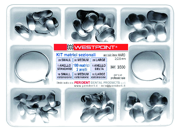 Sistema di matrici sezionali – Kit 3500: 100 matrici + 2 anelli WestpointSistema di matrici sezionali in acciaio inox. Composto da matrici sezionali bombate ed anelli di ritenzione. Confezione: – 1 anello Standard – 1 anello Delta – 20 matrici sezionali small – 30 matrici sezionali medium – 20 matrici sezionali large – 10 matrici sezionali small con estensione – 10 matrici sezionali medium con estensione – 10 matrici sezionali large con estensione